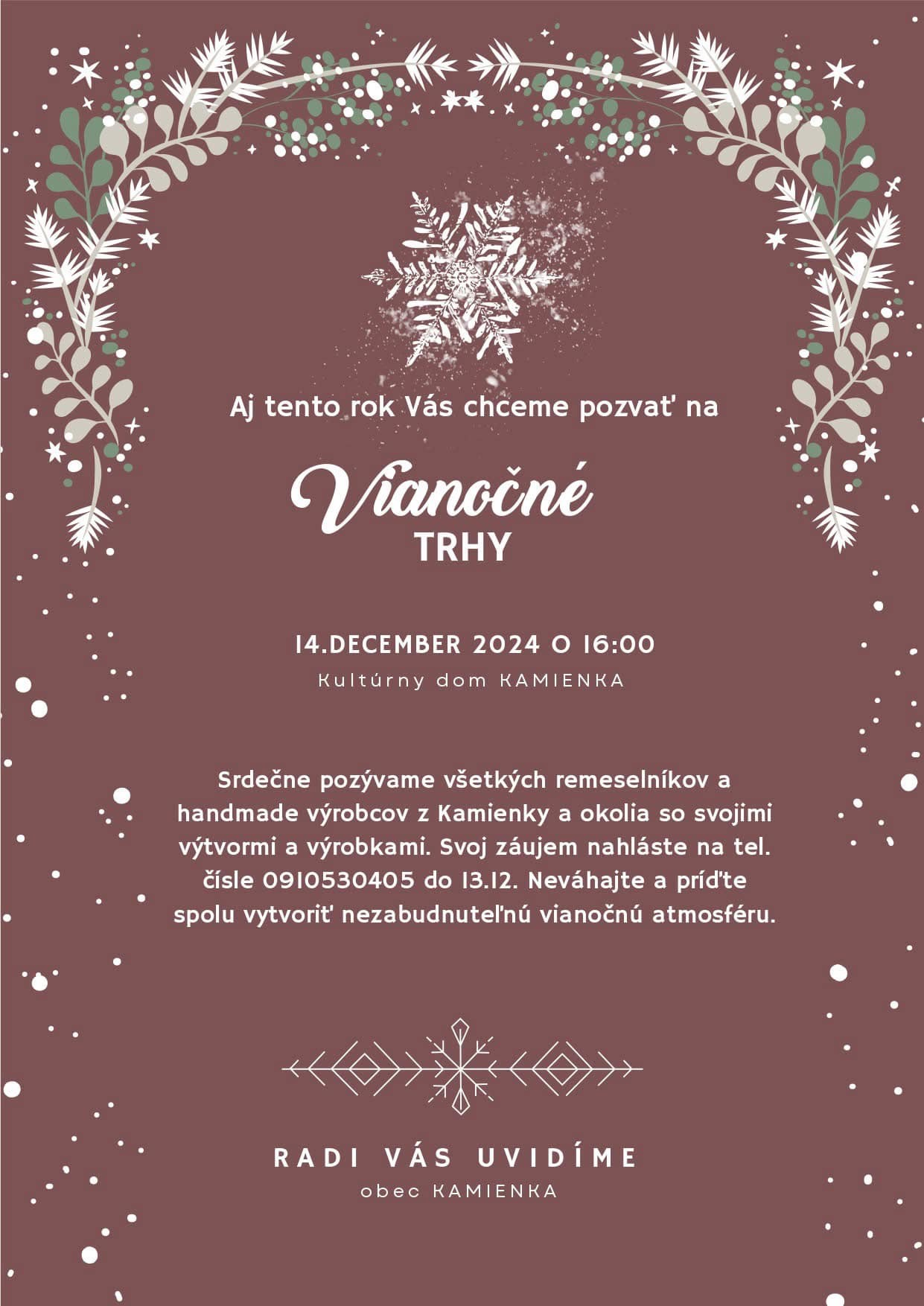 Srdečne pozývame všetkých remeselníkov a handmade výrobcov z Kamienky a okolia so svojimi výtvormi a výrobkami. Svoj záujem nahláste na tel. čísle 0910530405 do 13.12.2024. Neváhajte a príďte spolu vytvoriť nezabudnuteľnú vianočnú atmosféru 14.12.2024 (sobota) o 16:00 h. do Kultúrneho domu v Kamienke.