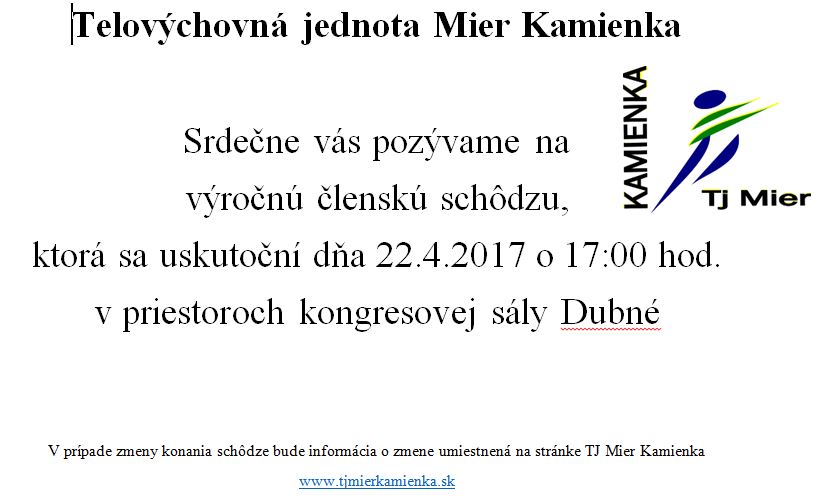 Telovýchovná jednota Mier Kamienka, srdečne pozýva na výročnú členskú schôdzu, ktorá sa uskutoční dňa 22.4.2017 o 17:00 hod. v priestoroch kongresovej sály DUBNÉ.