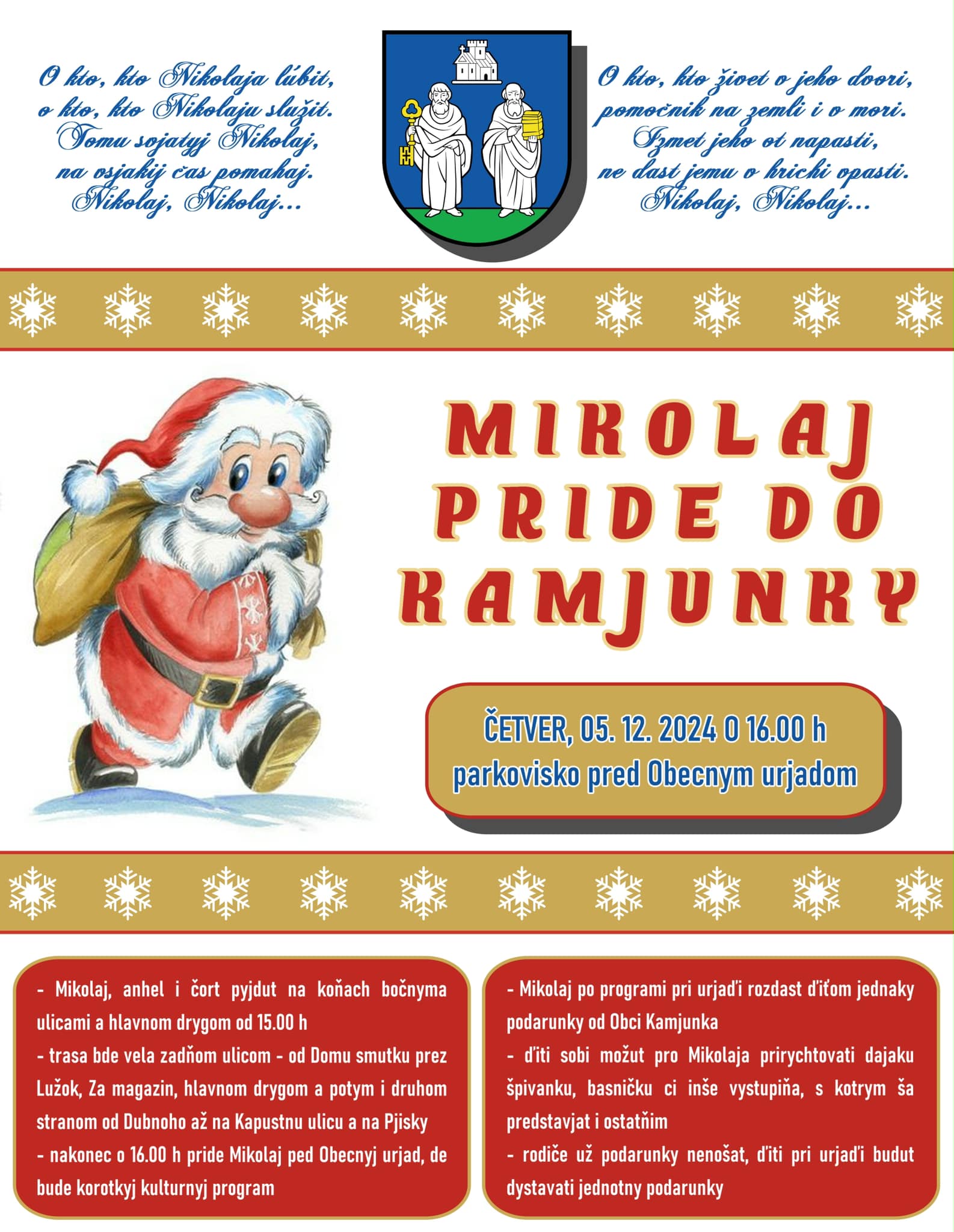 Pozyvame rodičyv, ďiti, starych rodičyv i šyroku verejnosť na akciju MIKOLAJ PRIDE DO KAMJUNKY, dňa 5.12.2024 (četver) o 16:00 hod. parkovisko pred Obecnym urjadom.