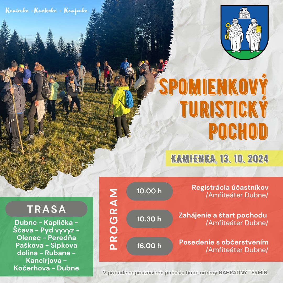 Obec Kamienka pozýva na SPOMIENKOVÝ TURISTICKÝ POCHOD, ktorý sa uskutočni 13.10.2024 so začiatkom o 10.00 h od Amfiteátra Dubne.