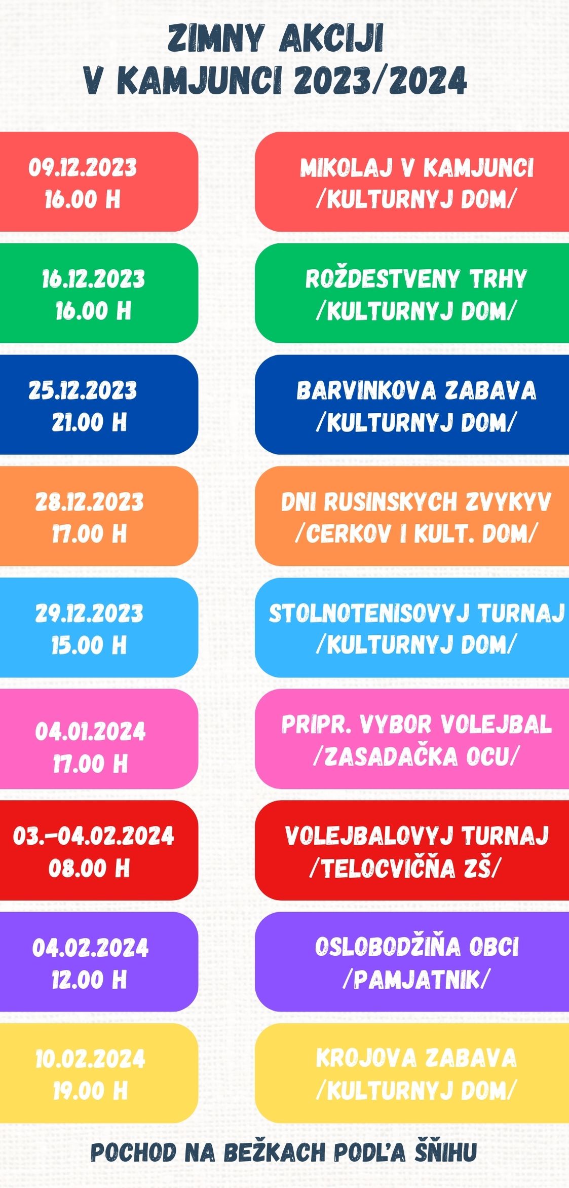 Podujatie začne o 17.00 h "Roždestvenym molebenom" v miestnom chráme a tiež koncertom rusínskych kolied. Následne sa účinkujúci a diváci presunú do Kultúrneho domu v Kamienke, kde sa uskutoční folklórny program hosťujúcich a domácich kolektívov. Bližšie informácie o účinkujúcich a programe nájdete v priložených plagátoch v slovenskom i rusínskom jazyku.