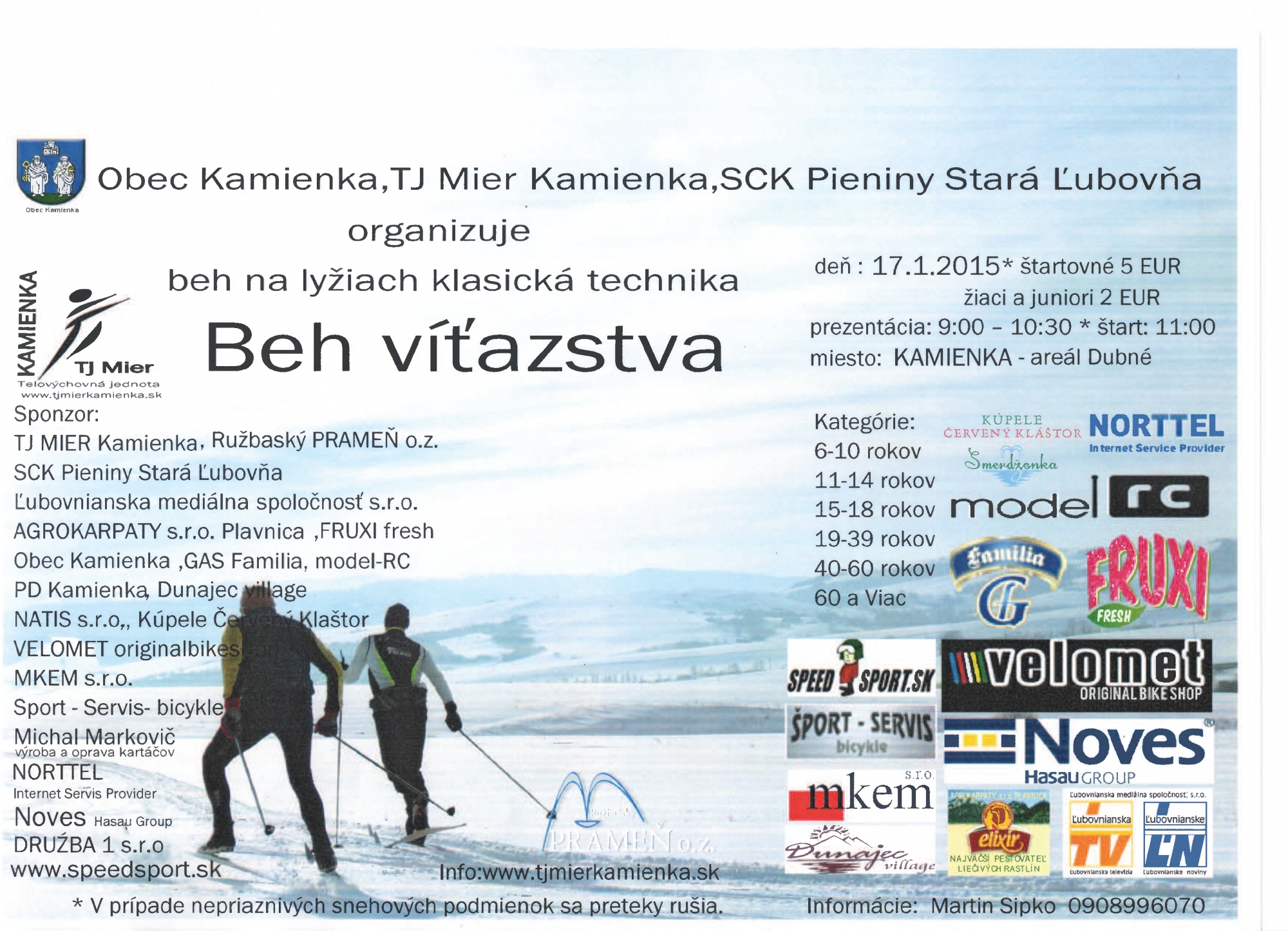Obec Kamienka, TJ Mier Kamienka, SCK Pieniny Stará Ľubovňa organizuje beh na lyžiach klasická technika BEH VÍŤAZSTVA dňa: 17.01.2015 prezentácia: 9:00 - 10:30 * štart: 11:00 hod. miesto: Kamienka - areál Dubné